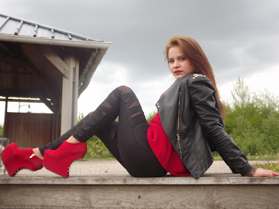 Pour cette séance photos, et par un ciel couvert, j'ai adopté des leggings ajourés en bandes collants, un top tunique à volants façon patineuse et mon mini blouson en cuir cloutés comme ces" hooves " ( chaussures à plateforme sans talons ) en jouant sur l'intermédiaire de couleur rouge et noir.